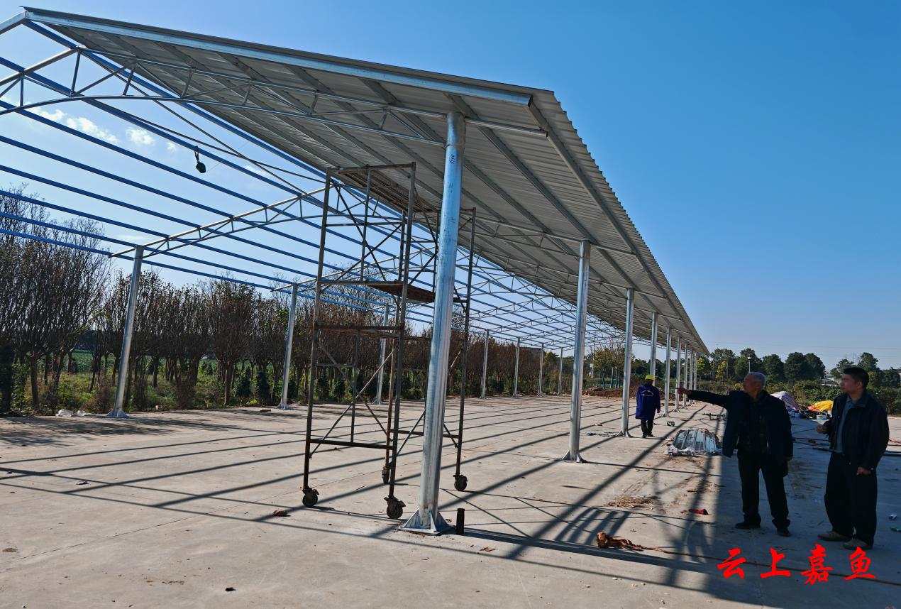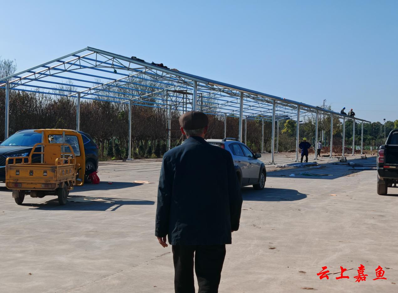 11月20日,記者跟著周明西,來到了停車場建設現場,看到工人們正在安裝停車場的棚頂。