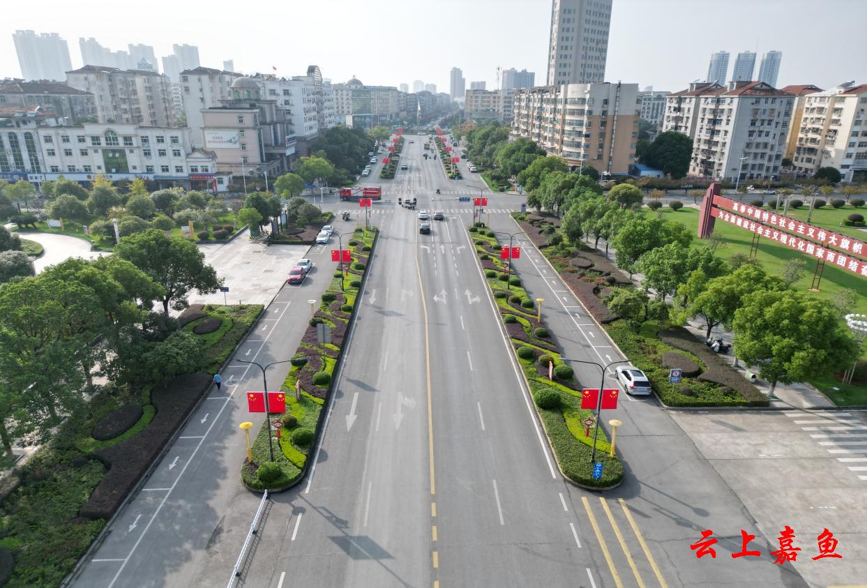 9月28日一大早,嘉魚縣人民大道上,縣園林局的工作人員正迎著朝陽在路燈上懸掛五星紅旗,一面面紅旗迎風飄揚,將城市裝點得格外喜慶。