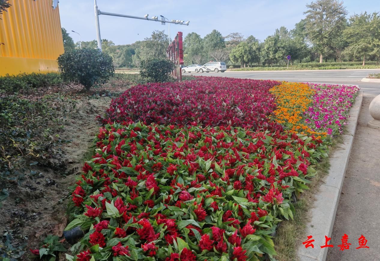 嘉魚東高速入口四周景觀帶,園林局用雞冠花、矮牽牛等3色花朵進行了造型,紅黃色的盆栽包圍著“嘉魚歡迎你”“詩經卷軸”等景觀,讓人遠遠地就能感受到嘉魚的熱情。