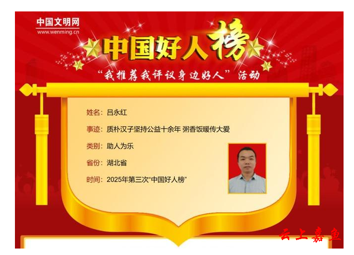 10月15日,中央文明辦發布2025年第三次“中國好人榜”,湖北省共有9人入選,其中咸寧市嘉魚縣呂永紅《質樸漢子堅持公益十余年 粥香飯暖傳大愛》的事跡入選助人為樂類“中國好人榜”。